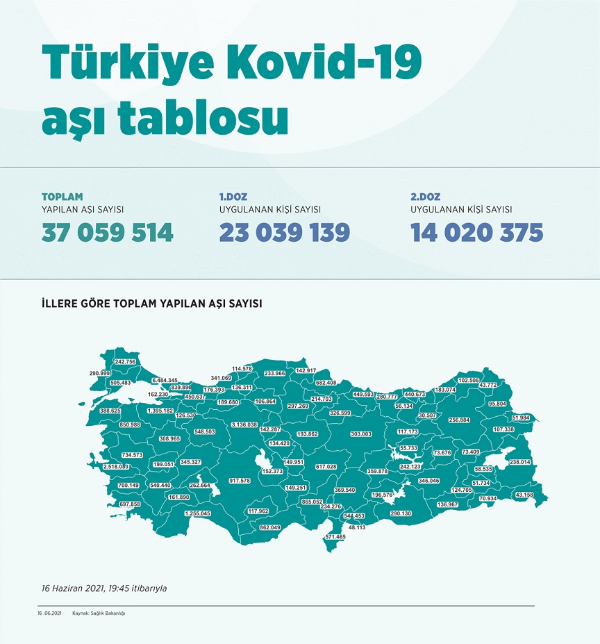 Sağlık Bakanlığının “covid19asi.saglik.gov.tr” Adresinde Yer Alan Anlık Verilere Göre, 16 Haziran Saat 19.45 İtibarıyla Uygulanan Birinci Doz Aşı Sayısı 23 Milyon 39 Bin 139, İkinci Doz 14 Milyon 20 Bin 375 Oldu. Böylece Toplam Doz Miktarı 37 Milyon 59 Bin 514’e Yükseldi.