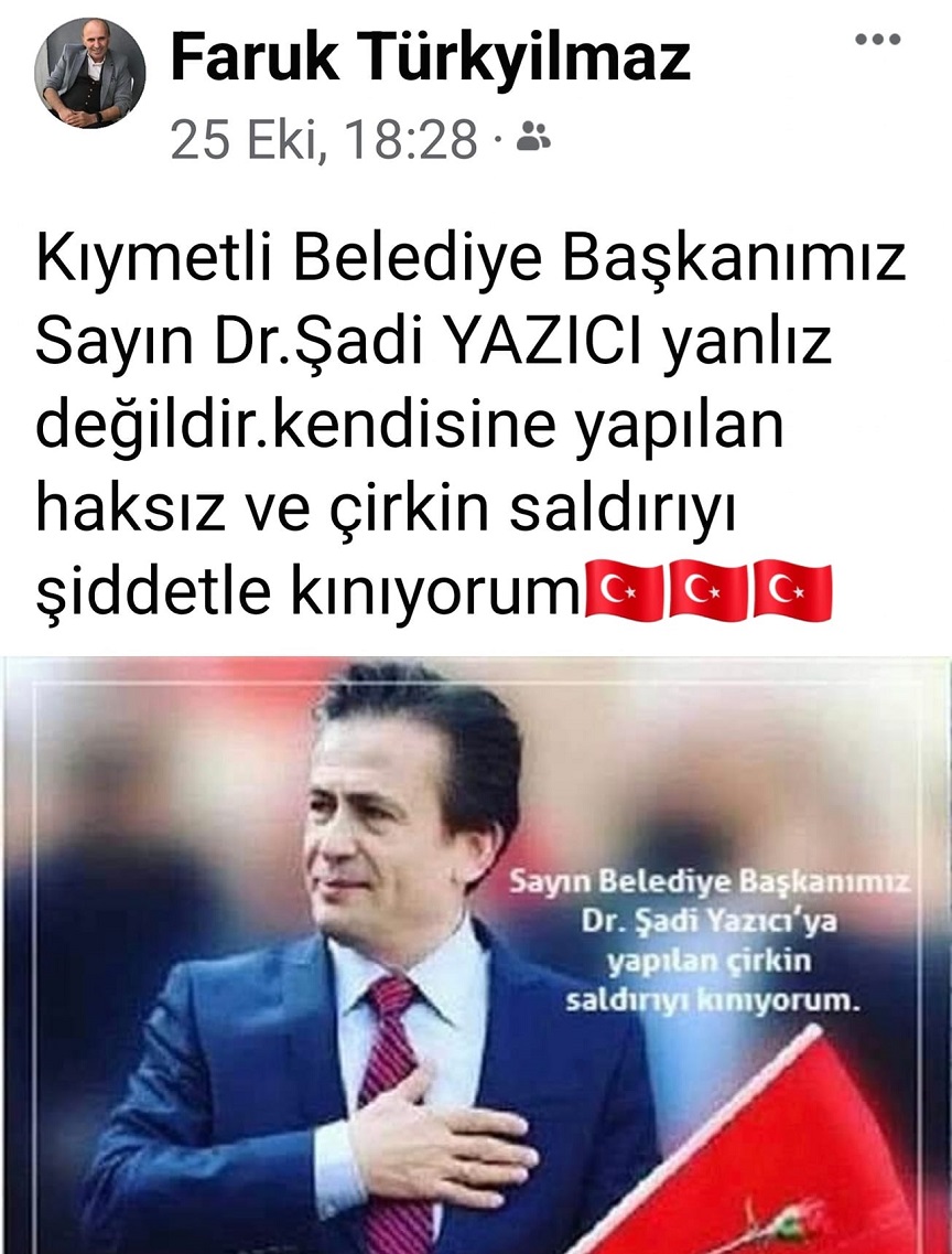 Davasına Sahip Çıkan Faruk Türkyılmaz 25 Ekim’de İBB Açılışından Yaşanan Saldırıyı Kıymetli Belediye Başkanımız Sayın Dr.Şadi Yazıcı Yalnız Değildir. Kendisine Yapılan Haksız ve Çirkin Saldırıyı Şiddetle Kınıyorum İfadelerini Kullanarak Paylaşmıştı.