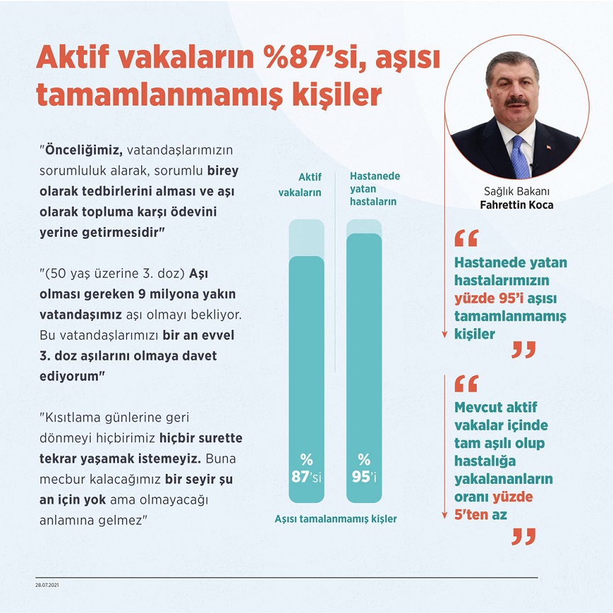 “Tüm Sağlık Altyapısını Dijital Olarak Yönetebilen Bir Ülkeyiz. Elimizde Tüm Tedavi Ve Tedbirleri Yönetebilecek Dijital Bir Altyapı Var. Kontrolü Elde Tutabilmek İçin Tüm Verileri Anlık Olarak Tuttuğumuz Karar Destek Sistemlerimiz Var. Buradan Yaptığımız Ön İncelemeler Bazı Sonuçlara İşaret Ediyor. Örneğin, Şu An Aktif Vakalarımızın Yaklaşık Yüzde 87’si Aşısı Tamamlanmamış Kişiler. Mevcut Aktif Vakalar İçinde Tam Aşılı Olup Hastalığa Yakalananların Oranı Yüzde 5’ten Az. Hastanede Yatan Hastalarımızın Yüzde 95’i De Aşısı Tamamlanmamış Kişiler.”