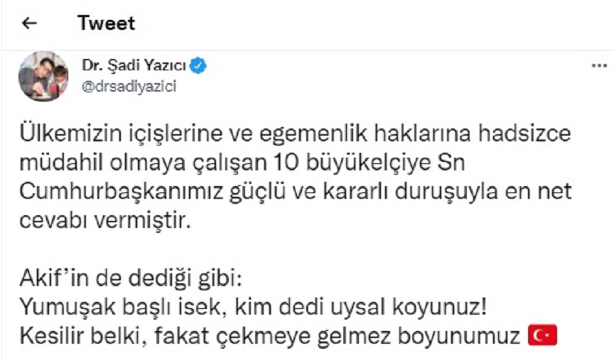 Tuzla Belediye Başkanı Dr. Şadi Yazıcı, Osman Kavala İçin Ortak Bildiri Yayınlayan ve Bugün Geri Adım Atan 10 Büyükelçiye Mehmet Akif Ersoy’un Sözleri İle Cevap Verdi. Başkan Yazıcı, Yaptığı Açıklamada, “Yumuşak Başlı İsek, Kim Dedi Uysal Koyunuz. Kesilir Belki, Fakat Çekmeye Gelmez Boyunum” Dedi.