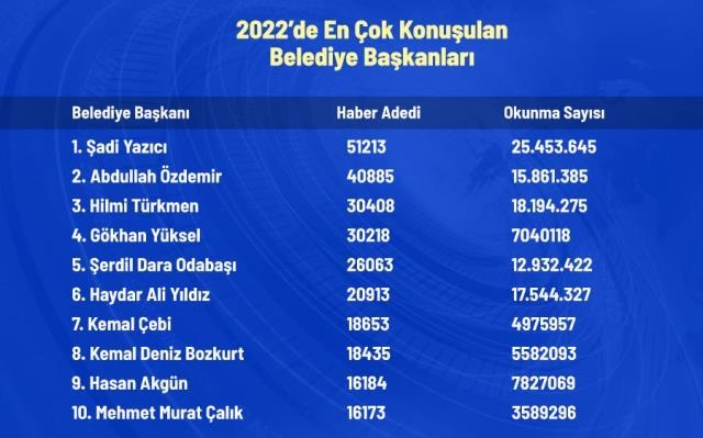 10 İsmin Yer Aldığı Listenin Zirvesinde 51 Bin 213 Haberle AK Partili Tuzla Belediye Başkanı Şadi Yazıcı Yer Aldı. Yazıcı’nın Haberlerinin Toplam Okunma Sayısı İse 25 Milyon 453 Bin Oldu. Yazıcı’yı 40 Bin 885 Haberle Bağcılar Belediye Başkanı Abdullah Özdemir Takip Etti. Özdemir İle İlgili Haberlerin Okunma Sayısı 15 Milyon 861 Olarak Açıklandı.