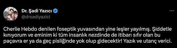 Başkan Yazıcı Sosyal Medya Hesabından Paylaştığı Mesajda, “Cherlie Hebdo Denilen Foseptik Yuvasından Yine Leşler Yayılmış. Şiddetle Kınıyorum ve Eminim Ki Tüm İnsanlık Nezdinde de İtibarı Sıfır Olan Bu Paçavra Er Ya da Geç Pisliğinde Yok Olup Gidecektir! Yazık ve Utanç Verici” İfadelerini Kullandı.