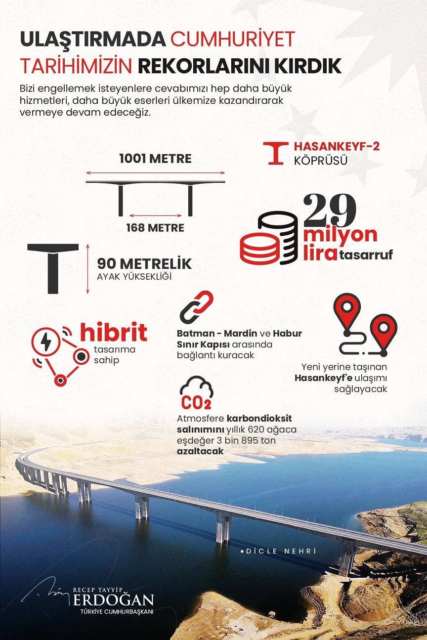 Cumhurbaşkanı Erdoğan, “Toplam Yatırım Tutarı 439 Milyon Lirayı Bulan Bu Köprü Su Altında Kalan Batman-Midyat Yolunun Göl Sahası Dışında İnşa Edilen Hasankeyf’in Yeni Merkeziyle Olan İrtibatını Da Sağlayacaktır. Açılışını Yaptığımız Projeyle Zamandan Ve Akaryakıttan Önemli Ölçüde Tasarruf Edilecektir. Batman, Mardin Ve Habur Sınır Kapısı Arasındaki İrtibatı Da Sağlayacak Bu Köprünün Bölgemiz Ticaretine Çarpan Etkisi Olacaktır.” Diye Konuştu.
