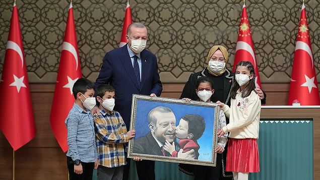 Programda Erdoğan’a, İstanbul Saray Çocuk Evleri Sitesinden Nuray Ariz ve Furkancan Gürel Tarafından Yapılan ve Cumhurbaşkanı Erdoğan İle Bir Çocuğun Yer Aldığı Yağlı Boya Tablo Hediye Edildi.