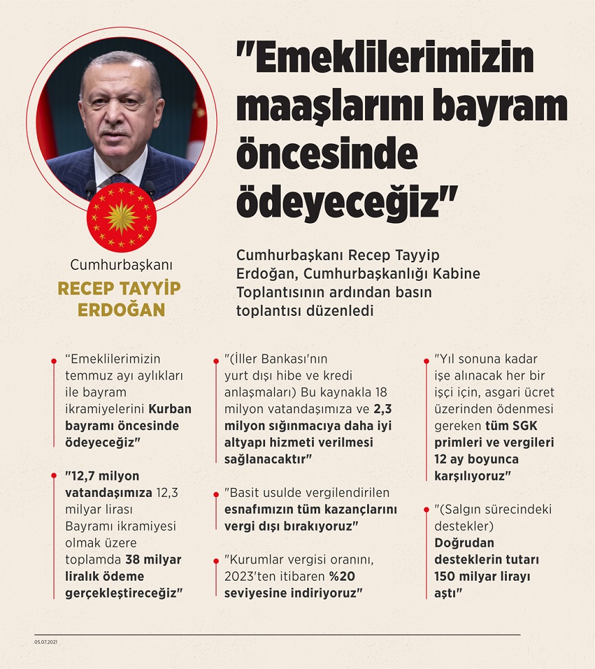 “Emeklilerimize Bir Müjde Vermek İstiyorum. Emeklilerimizin Temmuz Ayı Emekli Aylıkları İle Bayram İkramiyelerini Kurban Bayramı Öncesinde Ödeyeceğiz. Yine Emeklilerimizin Aylıklarında Ocak-Temmuz Dönemi TÜFE Oranını Dikkate Alarak Yüzde 8,45 Oranında Artış Yapıyoruz. Böylece 12,7 Milyon Vatandaşımıza 12,3 Milyar Lirası Kurban Bayramı İkramiyesi Olmak Üzere Toplamda 38 Milyar Liralık Bir Ödeme Gerçekleştireceğiz. Diğer Yandan İller Bankamız, Avrupa Birliği, Dünya Bankası ve Fransız Kalkınma Ajansı İle 15 Belediyemizi Kapsayan Toplamı 5,8 Milyar Lirayı Bulan Bir Hibe ve Kredi Anlaşması İmzaladı. Bu Kaynakla 18 Milyon Vatandaşımıza ve 2,3 Milyon Sığınmacıya Daha İyi Altyapı Hizmeti Verilmesi Sağlanacaktır.”