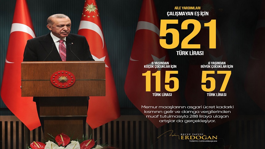 Aile Yardımları da Çalışmayan Eş İçin 521 Lira, 6 Yaşından Küçük Çocuklar İçin 115 Lira, 6 Yaşından Büyük Çocuklar İçin 57 Lira Olarak Güncellenmiştir. Tabii Bu Rakamlara Memur Maaşlarının Asgari Ücret Kadarki Kısmının Gelir ve Damga Vergilerinden Muaf Tutulmasıyla Ortaya Çıkan ve 288 Liraya Kadar Ulaşan Artışları da İlave Etmek Gerekiyor.”