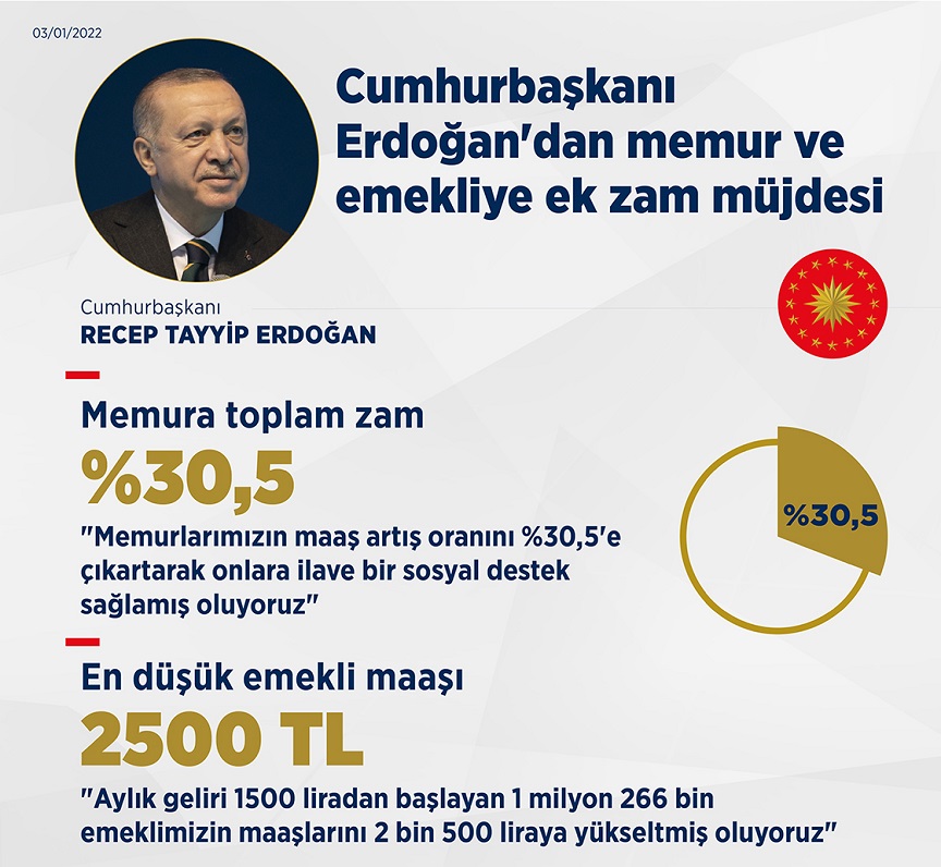 Memurlarımızın Maaşlarında Temmuz-Aralık Ayı Enflasyon Farkı ve Toplu Sözleşme Gereği Olarak Toplamda Yüzde 28 Oranında Bir Artış Yapıldı. Bununla Kalmadık, Memurlarımızın Ocak Ayındaki Yüzde 5’lik Toplu Sözleşme Dönem Zammını Yüzde 2,5 Artışla Yüzde 7,5 Olarak Uygulama Kararı Aldık. Böylece Memurlarımızın Maaş Artış Oranını Yüzde 30,5’e Çıkararak Onlara İlave Bir Sosyal Destek Sağlamış Oluyoruz.
