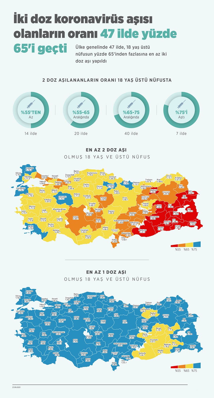 18 YAŞ ÜSTÜ NÜFUSUNUN YÜZDE 55-65’İNİN İKİ DOZ AŞILANDIĞI İLLER