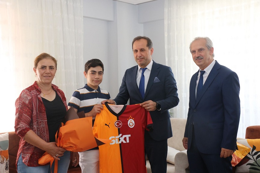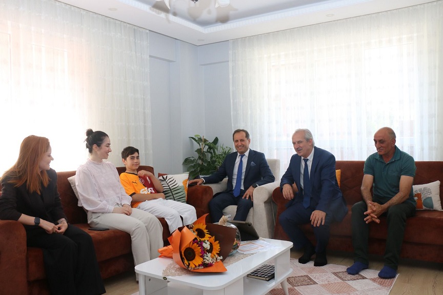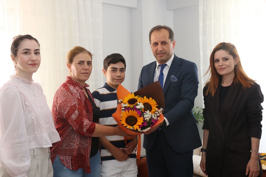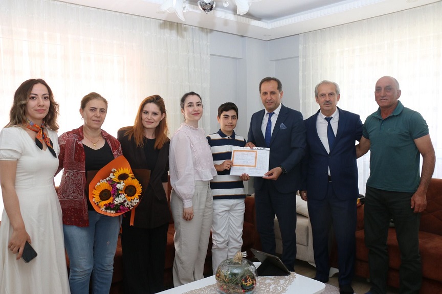 Evde eğitim süreci boyunca Bulut’un yanında olan öğretmenleri Zeynep Ulucan, Sonnur Kayaoğlu ve Okul Müdürü Yılmaz Ünlütürk de bu özel günde öğrencilerini yalnız bırakmadı.
