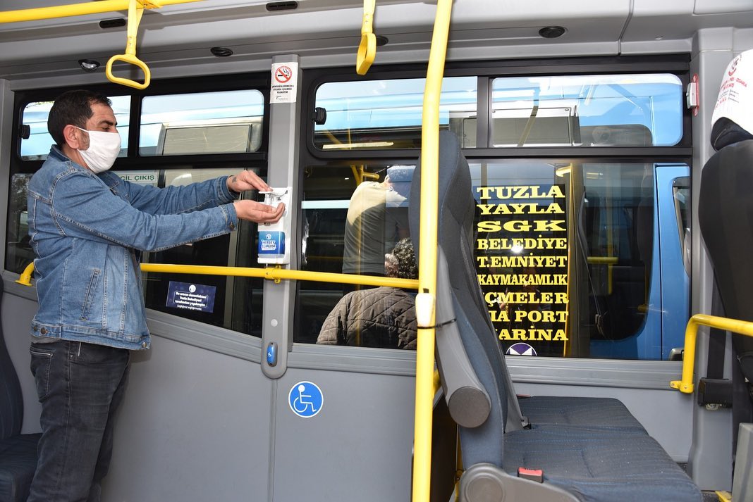 TUZLA BELEDİYESİ’NDEN TÜM MİNİBÜSLERE EL DEZENFEKTANI HER ŞEY ELİMİZDE