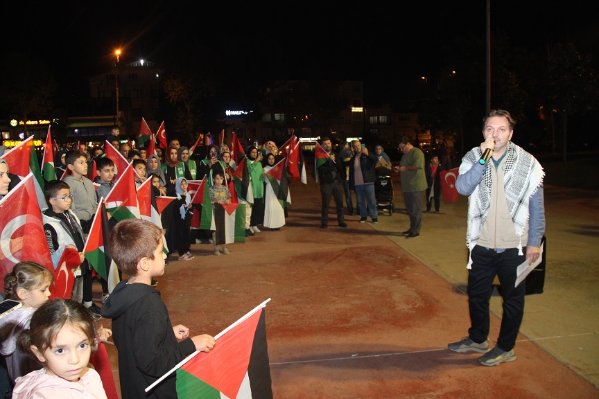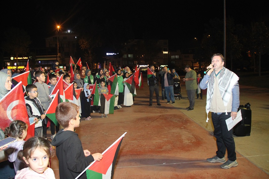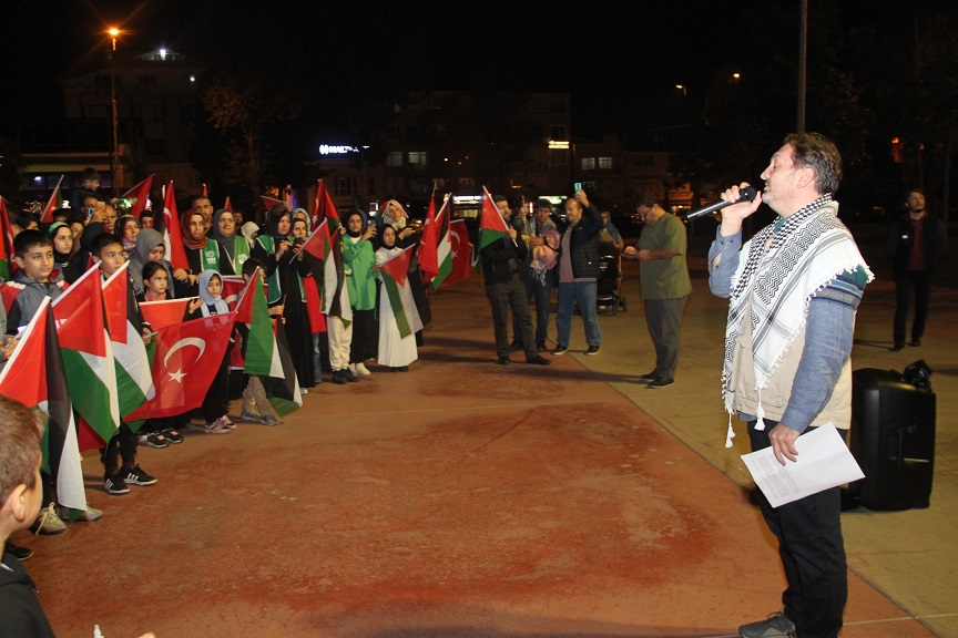 Kudüs Konvoyun Ardından Basın Açıklaması Yapan İHH (İnsani Yardım Vakfı) Tuzla Temsilcisi Mehmet Tahir Aydınlı ‘Bu Yaşanılan Katliamlar Yeni Değildir. İşgalci İsrail Tam 75 Yıldır Tüm Dünyanın Gözü Önünde Böl, Parçala ve Yut Stratejisiyle Filistinlilere Baskı ve Zulüm Uyguluyor. Filistin’de Bugüne Kadar Öldürülen Çocuk ve Kadın Sayısı Binlerle İfade Edilmektedir. Şu Tarihi Gerçek Çok İyi Bilinmelidir Ki; İşgalci İsrail’in Asıl Amacı Gazze’yi Tamamen İnsansız Hale Getirmektir. Bunun İçin Elektrik, Su, Mazot ve Hiçbir İnsani Yardımın Girmesine İzin Vermedikleri Gazze’de Sivil Yerleşim Yerleri, Hastaneler, Pazar Yerleri Camiler ve Okullar Bombalanıyor. İHH Tuzla Temsilcisi Mehmet Tahir Aydınlı Konuşması ‘Kudüs Bizimdir, Bizim Kalacak’, ‘Hamas’a Selam, Direnişe Devam’, ‘Katil İsrail, Filistin’den Defol’ Sloganlarıyla Kesildi.