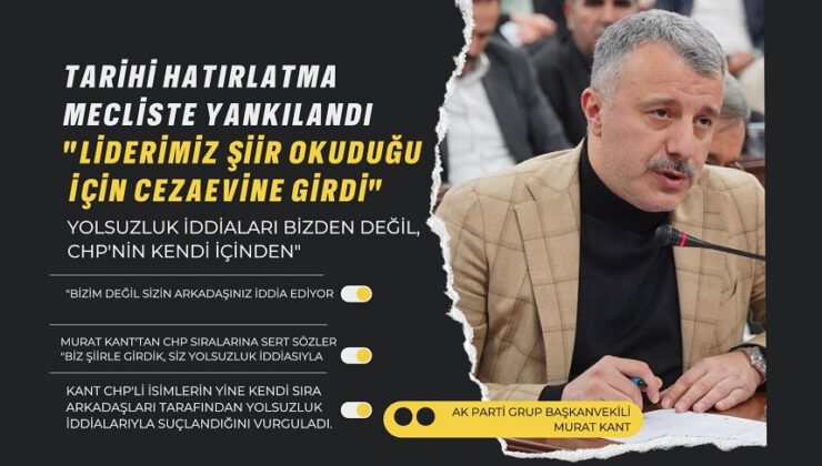 Toplantının gündem dışı konuşmalar bölümünde söz alan AK Parti Grup Başkanvekili Murat Kant, İstanbul Büyükşehir Belediyesi’nde yaşanan yolsuzluk iddialarına ilişkin sert ifadeler kullandı. Kant, Cumhurbaşkanı ve AK Parti Genel Başkanı Recep Tayyip Erdoğan’ın geçmişte şiir okuduğu için cezaevine girdiğini hatırlatarak, bugünkü tabloyla dikkat çekici bir karşılaştırma yaptı.