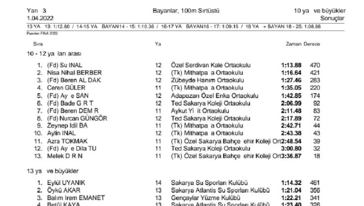 Sakarya’da Düzenlenen Okullar Arası Yüzme Müsabakaları Bugün Startı Verildi. Kale Okulları Öğrencilerinden Su İnal Bugün Yapılan 100 Metre Sırtüstü ve 200m Serbest Kategorisini Birincilikle Tamamladı.