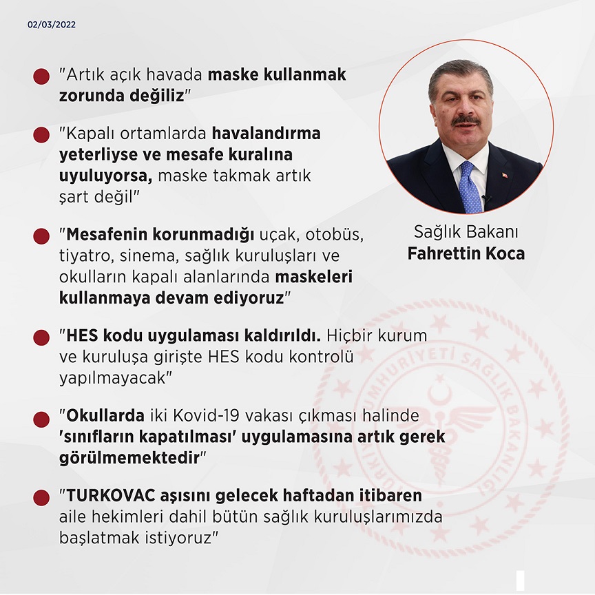 “Artık Açık Havada Maske Kullanmak Zorunda Değiliz. Kapalı Ortamlarda Havalandırma Yeterliyse Ve Mesafe Kuralına Uyum Gösterilebiliyorsa Maske Takmak Artık Şart Değil. Yeni Dönemde HES Kodu Uygulaması Kaldırıldı. Hiçbir Kurum Ya da Kuruluşa Girişte HES Kodu Kontrolü Yapılmayacak. Hastalık Belirtisi Olmayan Kişilerden Test İstenmeyecek. Okullarda, İki Vaka Çıkması Halinde Sınıfın Kapatılması Şeklindeki Uygulamaya Artık Gerek Görülmemektedir. Pozitif Çıkan Öğrencinin İzole Edilmesi Yeterli Bulunacak ve Eğitim Devam Edecektir.”