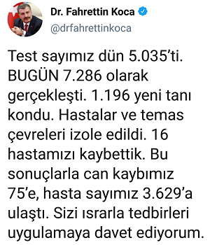 Sağlık Bakanı Fahrettin Koca Resmi Twitter Hesabından Türkiye’de Son 24 Saatte Koronavirüs Vaka ve Can Kaybı Sayılarını Paylaştı. Buna Göre Can Kaybımız 75’e, Hasta Sayımız 3.629’a Ulaştı.