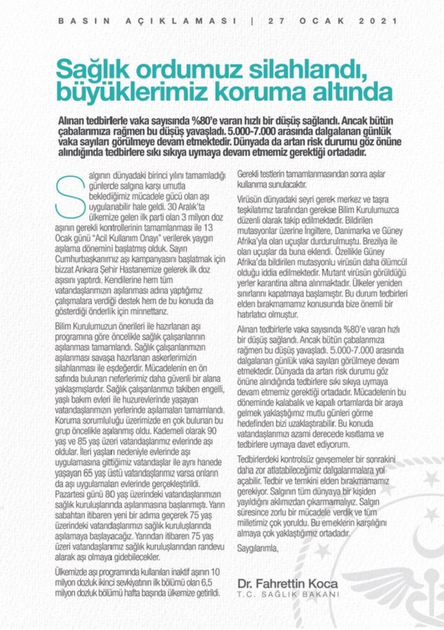 Açıklamasında, “Sağlık Ordumuz Silahlandı, Büyüklerimiz Koruma Altında” Başlığına Yer Veren Koca, Salgının Dünyadaki Birinci Yılını Tamamladığı Günlerde Salgına Karşı Umutla Beklenen Mücadele Gücü Olan Aşının Uygulanabilir Hale Geldiğini Belirtti.