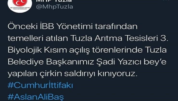 Cumhur İttifakı Ortaklarından MHP Tuzla İlçe Başkanı Aslan Ali Baş Önceki İBB Yönetimi Tarafından Temeli Atılan Tuzla Artıma Tesisleri 3. Biyolojik Kısım Açılış Töreninde Tuzla Belediye Başkanımız Dr.Şadi Yazıcı Bey’e Yapılan Çirkin Saldırıyı Kınıyoruz İfadelerini Paylaştı.