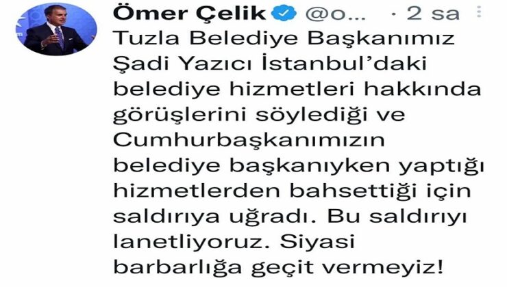 AK Parti Genel Başkan Yardımcısı, Parti Sözcüsü Ömer Çelik de “Bu Saldırıyı Lanetliyoruz. Siyasi Barbarlığa Geçit Vermeyiz” İfadelerini Kullandı.