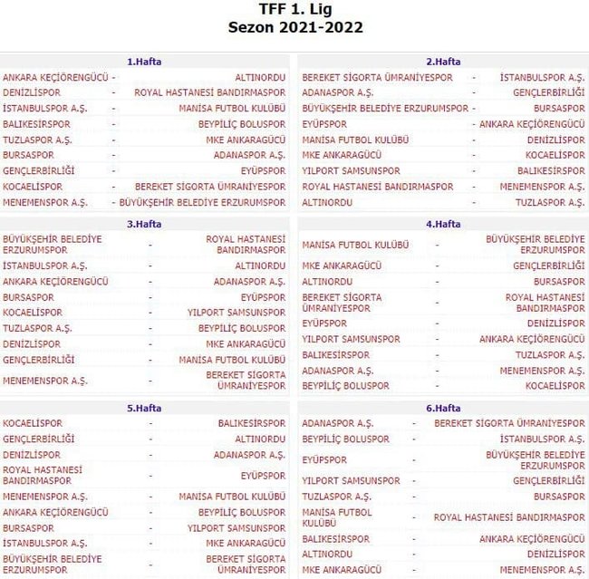 2021-2022 Sezonu TFF 1. Lig Fikstür Çekim Töreni 14 Temmuz Çarşamba Günü TFF Hasan Doğan Milli Takımlar Kamp ve Eğitim Tesisleri’nde Yapıldı. TFF 1. Lig, 13 Ağustos 2021 Tarihinde Oynanacak Maçlarla Başlayacak. İlk Yarı 27 Aralık 2021’de Sona Ererken, İkinci Yarı 7 Ocak 2022 Tarihinde Oynanacak Maçlar İle Başlayacak. 15 Mayıs 2022 Tarihinde Sona Erecek TFF 1. Ligde 5, 17, 25 ve 33. Hafta Maçları Hafta İçi Oynanacak.
