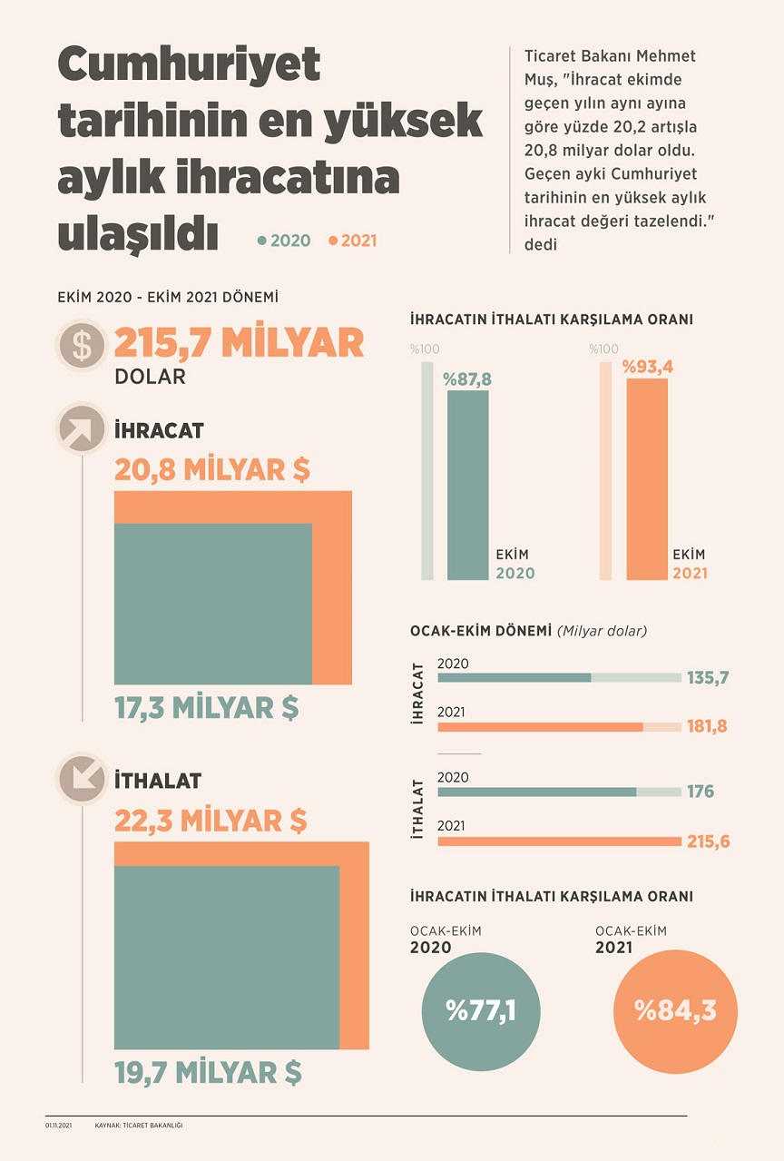 “Ocak-Ekim Dönemi İthalatımız, 2020’nin Aynı Dönemine Göre Yüzde 22,5 Artışla 215,6 Milyar Dolar Olarak Gerçekleşmiştir. Ekim Ayında İhracatın İthalatı Karşılama Oranı İse Geçtiğimiz Yılın Aynı Ayına Göre 5,6 Puan Artışla Yüzde 93,4’e Ulaşmıştır. Bakın, Dikkat Ederseniz İhracatımızın İthalatı Karşılama Oranı Sürekli Artış Eğilimindedir. Göreceksiniz Çok Kısa Bir Süre İçinde Dış Ticarette Fazla Veren Türkiye Hedefine Ulaşmış Olacağız. Karşılama Oranımız, Ocak-Ekim Döneminde İse Geçtiğimiz Yıla Göre 7,2 Puan Artışla Yüzde 84,3’e Yükselmiştir. Benzer Şekilde, Dış Ticaret Açığımız Ocak-Ekim Döneminde Geçtiğimiz Yılın Aynı Dönemine Göre Yaklaşık Yüzde 16 Azalarak 33,8 Milyar Dolara Gerilemiştir.”