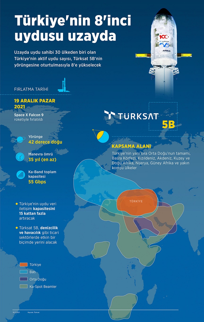 Türksat 5B, Türkiye’nin Yanı Sıra Orta Doğu’nun Tamamı, Basra Körfezi, Kızıldeniz, Akdeniz, Kuzey ve Doğu Afrika, Nijerya, Güney Afrika ve Yakın Komşu Ülkelerini İçeren Geniş Bir Kapsama Alanında Hizmet Verecek.