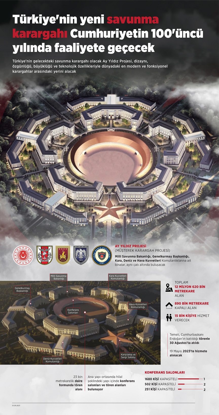Mimari Yapısıyla Dikkati Çeken Yerleşke 12 Milyon 620 Bin Metrekare Alanda Konumlanacak. Milli Savunma Bakanlığı, Genelkurmay Başkanlığı, Kara, Deniz ve Hava Kuvvetleri Komutanlıklarına Ait Binalar, “Ay Yıldız Projesi”nin Tamamlanmasıyla Aynı Çatı Altında Buluşturacak.