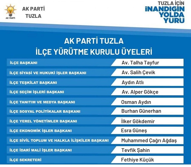 AK Parti Tuzla 7.Olağan İlçe Kongresinde İlçe Başkanı Seçilen Av.Talha Tayfur, 1 Şubat 2021 Tarihinde Yapılan Kongrenin Ertesi Günü Yeni Yönetim Kurulunun Toplayarak Tanışma Toplantısının Ardından Kolları Sıvayarak İkinci Toplantı Süreci Olan Bir Haftalık Zamanda Başkan Tayfur, Yapılan İstişareler Sonucunda Oluşan Yürütme Kurulunu Açıkladı.
