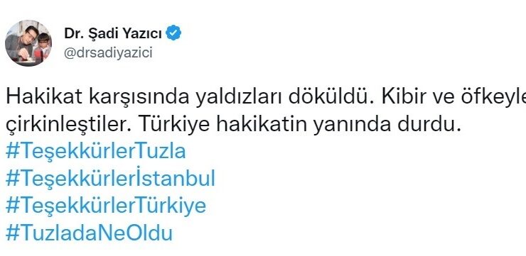 Tuzla Belediye Başkanı Dr. Şadi Yazıcı, Geçtiğimiz Salı Günü Düzenlenen Tuzla İleri Biyolojik Atıksu Arıtma Tesisinin Üçüncü Etabının Hizmete Açılışı Töreninde Yaşanan Saldırı Olayının Ardından Gelen Destek Mesajları ve Destek Telefonları İçin Teşekkür Mesajı Yayımladı.