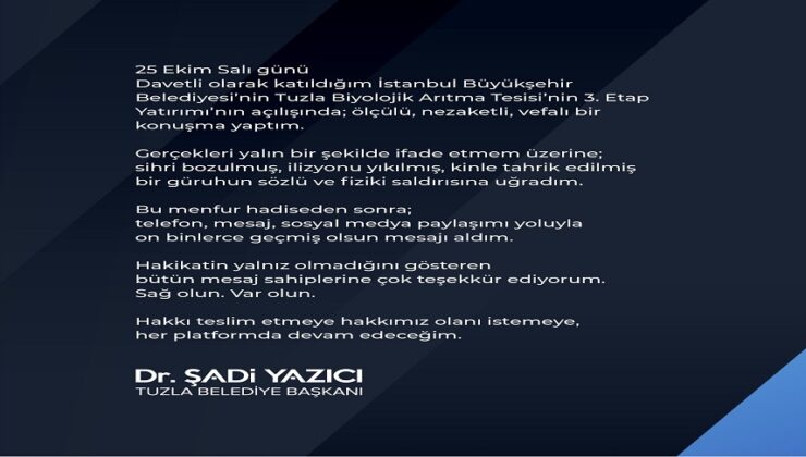 Başkan Yazıcı Yaptığı Açıklamada,”25 Ekim Salı Günü, Davetli Olarak Katıldığım İstanbul Büyükşehir Belediyesi’nin Tuzla Biyolojik Arıtma Tesisi’nin 3. Etap Yatırımı’nın Açılışında; Ölçülü, Nezaketli, Vefalı Bir Konuşma Yaptım. Gerçekleri Yalın Bir Şekilde İfade Etmem Üzerine; Sihri Bozulmuş, İlizyonu Yıkılmış, Kinle Tahrik Edilmiş Bir Güruhun Sözlü ve Fiziki Saldırısına Uğradım. Bu Menfur Hadiseden Sonra; Telefon, Mesaj, Sosyal Medya Paylaşımı Yoluyla On Binlerce Geçmiş Olsun Mesajı Aldım. Hakikatin Yalnız Olmadığını Gösteren Bütün Mesaj Sahiplerine Çok Teşekkür Ediyorum. Sağ Olun. Var Olun. Hakkı Teslim Etmeye Hakkımız Olanı İstemeye, Her Platformda Devam Edeceğim” Dedi.