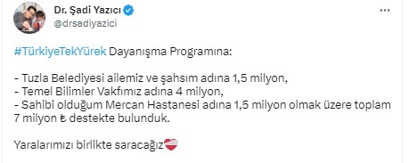 Tuzla Belediye Başkanı Dr. Şadi Yazıcı da Dayanışma Programına Katılarak, 7 Milyon Türk Lirası Değerinde Destekte Bulundu. Başkan Yazıcı Yaptığı Açıklamada,” Televizyonlarımızın “Türkiye Tek Yürek“ Dayanışma Programına: Belediye Personelimiz ve Şahsım Adına 1,5 Milyon, Temel Bilimler Vakfımız Adına 4 Milyon, Ortağı Olduğum Mercan Hastanesi Adına 1,5 Milyon Olmak Üzere Toplam 7 Milyon Türk Lirası Destekte Bulunduk. Katkı Sunan Herkese Teşekkür Ediyorum. Yaralarımızı Birlikte Saracağız” İfadelerine Yer Verdi.