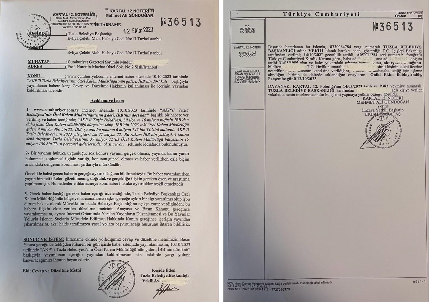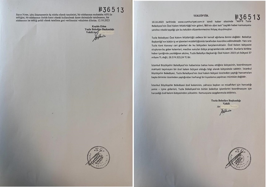 Cumhuriyet Gazetesi’nin Tuzla Belediyesi’nin Özel Kalem Müdürlüğü’nün Gideri, İBB’nin Dört Katı Başlıklı Yanıltıcı ve Algı Haberine Tuzla Belediyesi’nden Tekzip Yapıldı. Tuzla Belediyesi’nden Yapılan Açıklamada, “İstanbul Büyükşehir Belediyesi Özel Kaleminin; Yalnızca Başkan ve Misafirleri İçin Harcadığı Yeme – İçme Giderlerinin, Tuzla Belediyesi’nin Bütün Belediye İşlemlerini Koordinasyon İçin Harcadığı Özel Kalem Bütçesinden Yüksek Olduğunu Araştırmacı Habercilikle Tespit Etmeniz Mümkündür.” Dendi.