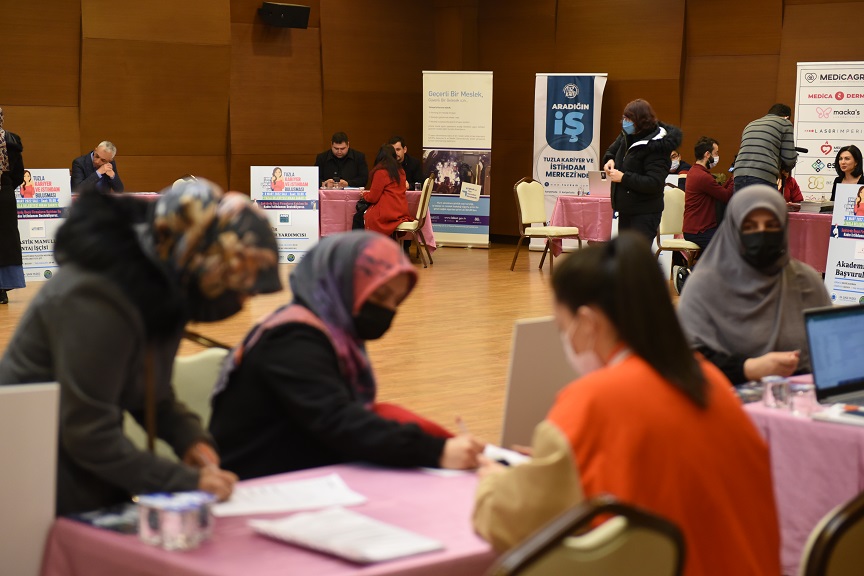 İş Arayan Vatandaşlar İle İşvereni Buluşturan Tuzla Belediyesi Kariyer ve İstihdam Merkezi, Toplu İş Görüşmeleri İle İstihdam Desteği Sağlamaya Devam Ediyor. Kariyer ve İstihdam Fuarı’ndan Esinlenerek Belirli Periyotlar Halinde Düzenlenen ve Birçok Farklı Firmanın Aynı Anda İş Görüşmesi Gerçekleştirdiği Programlara Bir Yenisi Daha Ekledi. Bu Kapsamda Tuzla Belediyesi Nikah Sarayı ve Kültür Merkezi’nde 15 Firmanın Katılımı İle 8 Mart Dünya Kadınlar Günü’ne Özel Toplu İş Görüşmesi Düzenlendi. Düzenlenen İş Görüşmesine Katılan 200 Kadın, Seçtikleri Firmanın İnsan Kaynakları İle Bire Bir Görüşme Gerçekleştirdi. Kadınlar Günü’nde İşe Yönlendirilen Kadınlar, Çifte Mutluluk Yaşadılar.