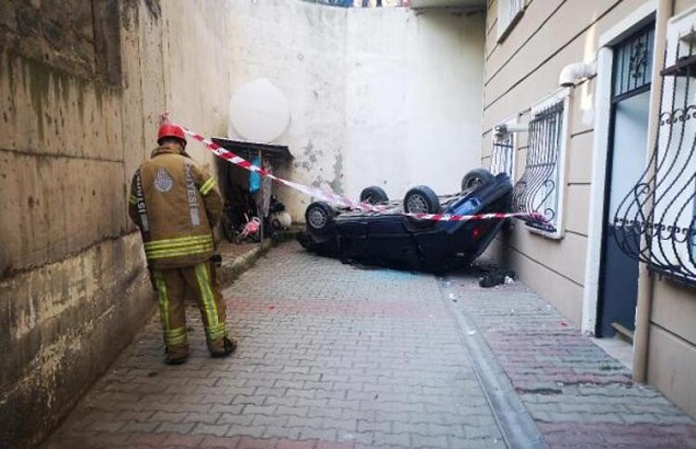ORTA MAHALLEDE OTOMOBİL 5 METRE YÜKSEKLİKTEN APARTMANIN BAHÇESİNE DÜŞTÜ