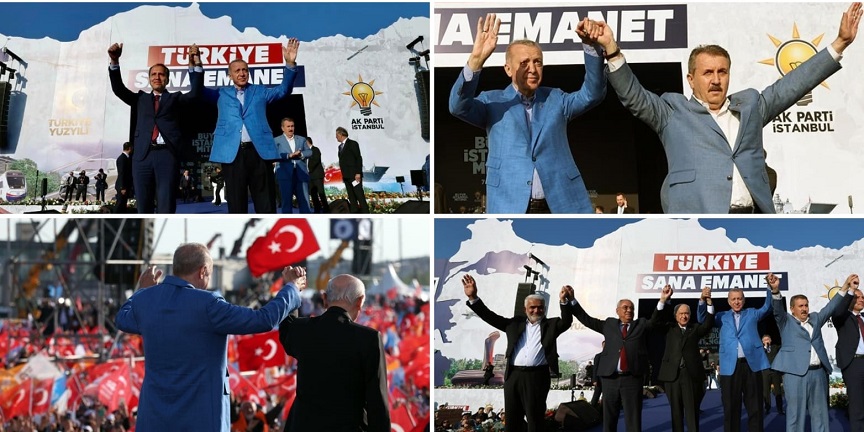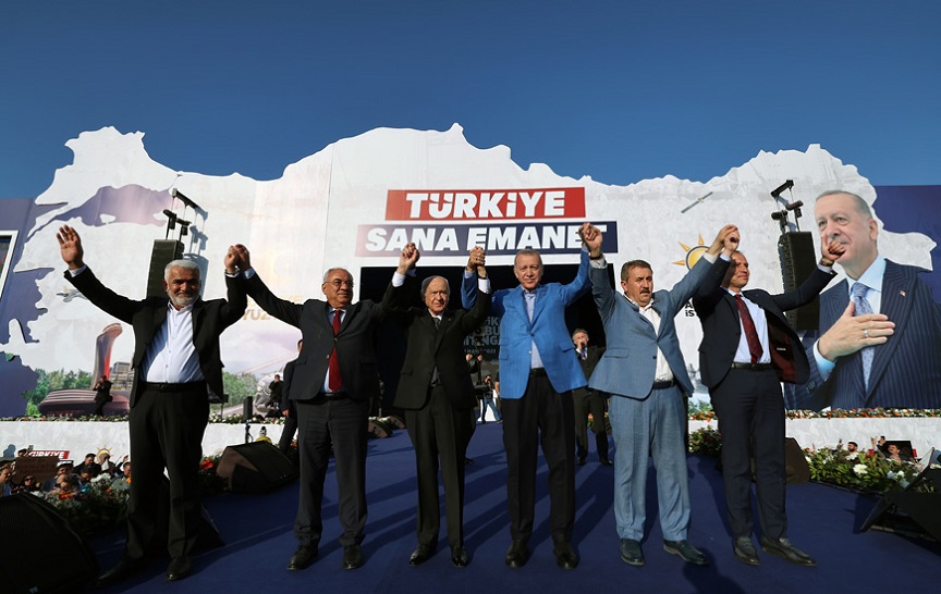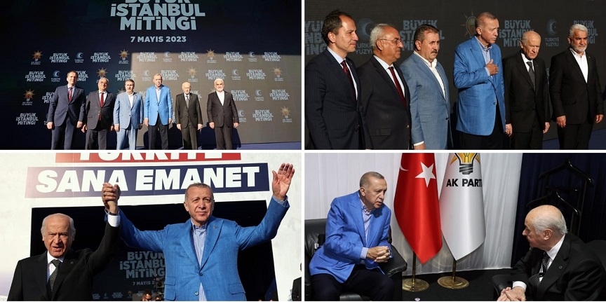 Daha sonra Cumhur İttifakı’nda bulunan MHP Genel Başkanı Devlet Bahçeli, BBP Genel Başkanı Mustafa Destici, Yeniden Refah Partisi Genel Başkanı Fatih Erbakan, DSP Genel Başkanı Önder Aksakal, HÜDA PAR Genel Başkanı Zekeriya Yapıcıoğlu teker teker sahneye çıkarak, Erdoğan ile halkı selamladı. Ardından Cumhurbaşkanı Erdoğan ile Genel Başkanlar el ele tutuşup selamlama yaptı.