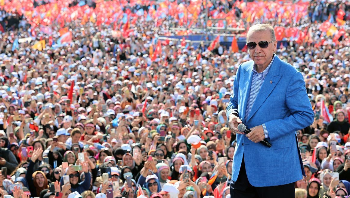 AK Parti’nin, Atatürk Havalimanı Millet Bahçesi’nde düzenlediği “Büyük İstanbul Mitingi”ne katılan ve eşi Emine Erdoğan ile beraber sahneye çıkan Cumhurbaşkanı Erdoğan, vatandaşları selamlarken, Cengiz Kurtoğlu’nun “Duyanlara Duymayanlara” şarkısına eşlik etti.