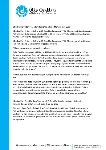 Ülkü Ocakları Eğitim ve Kültür Vakfı Genel Başkanı Ahmet Yiğit Yıldırım, yaptığı açıklamada Türkofobi İzleme Merkezi’nin kurulacağını duyurdu.