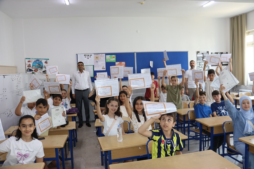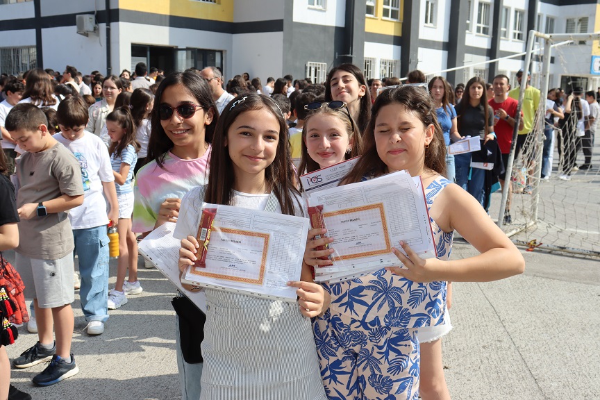 Karne töreni sonrasında öğrenciler karnelerini havaya kaldırarak büyük bir coşkuyla yaz tatiline giriş yaptı.